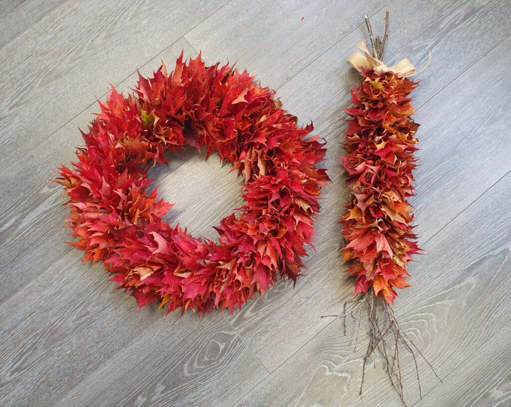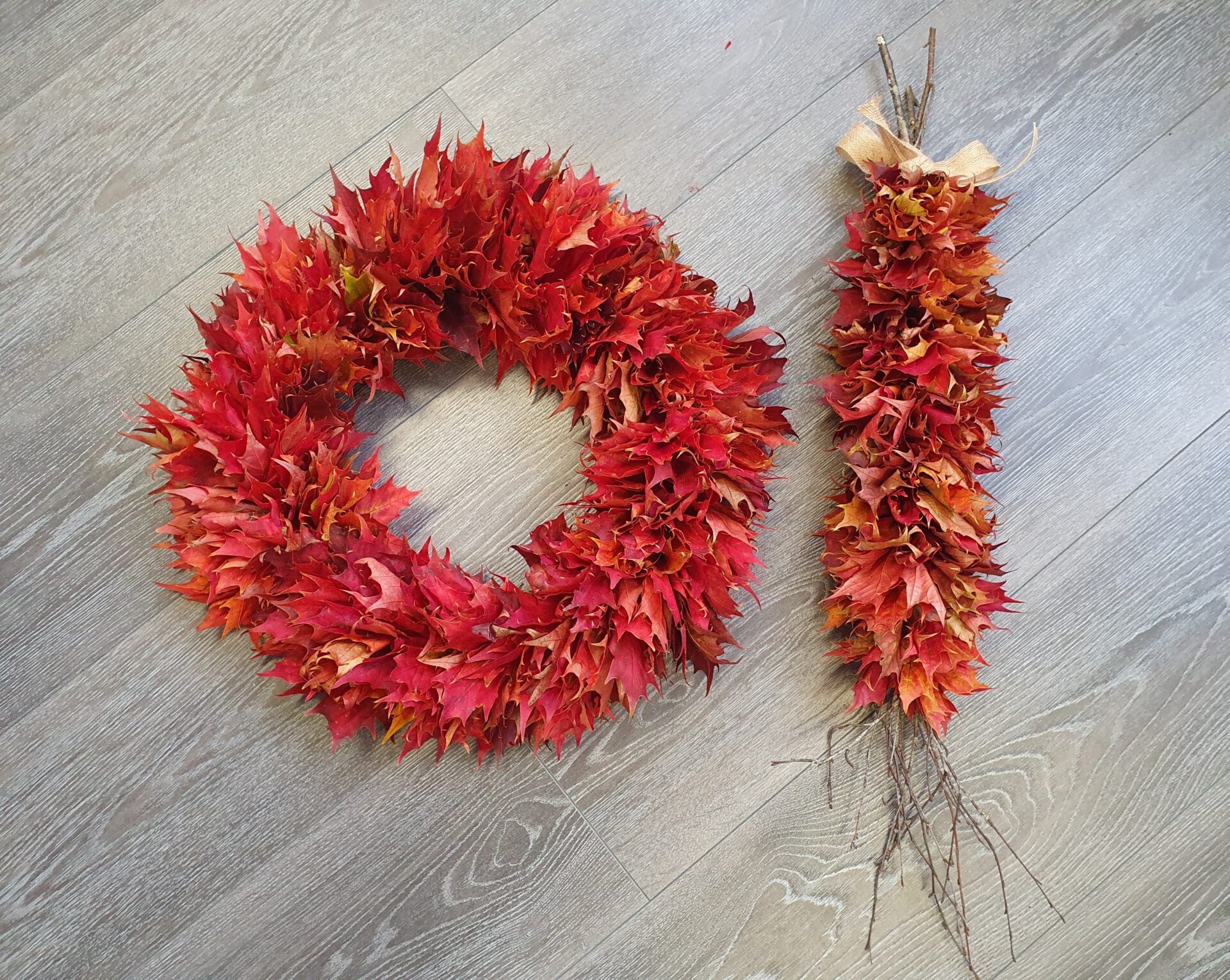 Ota mukaasi runsaasti erivärisiä vaahteran lehtiä tai puolukan varsia (havuja) ja pihlajanmarjoja. Jos sinulla on ohutta puolalankaa, sivu- ja oksaleikkurit ja koristenauhaa, ota myös ne mukaasi.